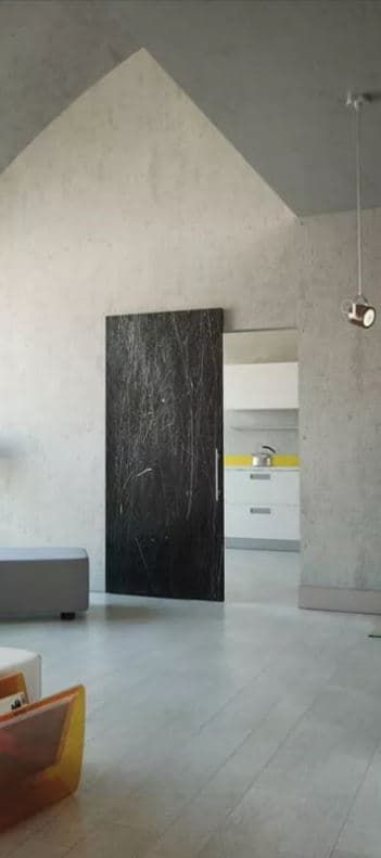 Невидимость: Дверь практически полностью скрыта в стене, без видимых наличников и коробок, что создает эффект единого пространства.